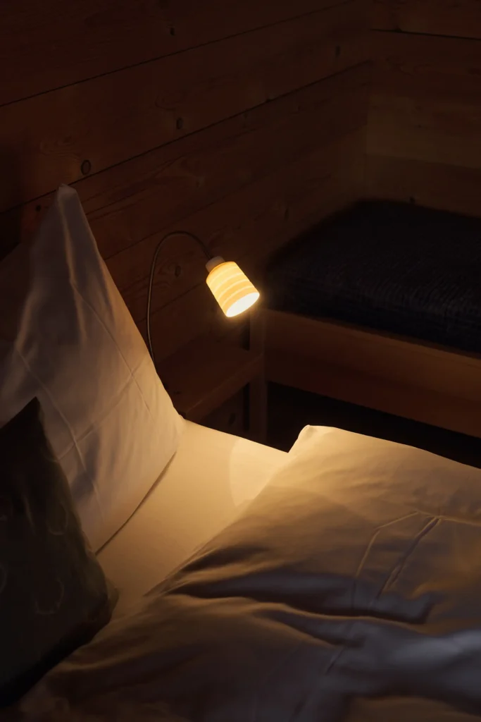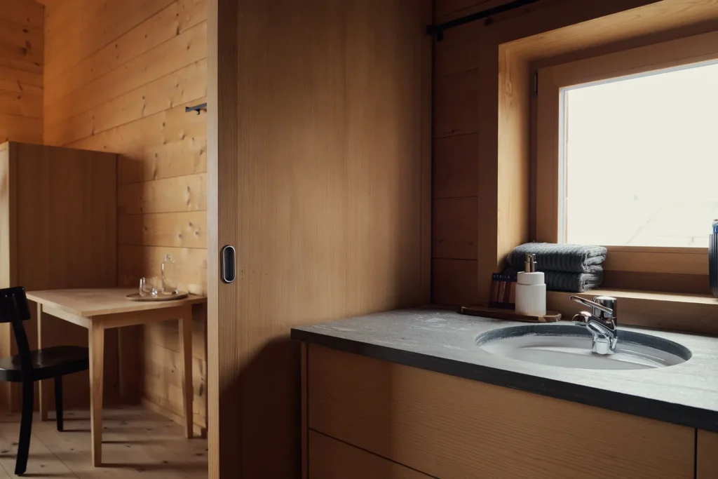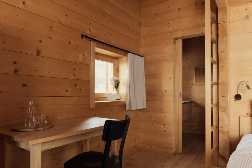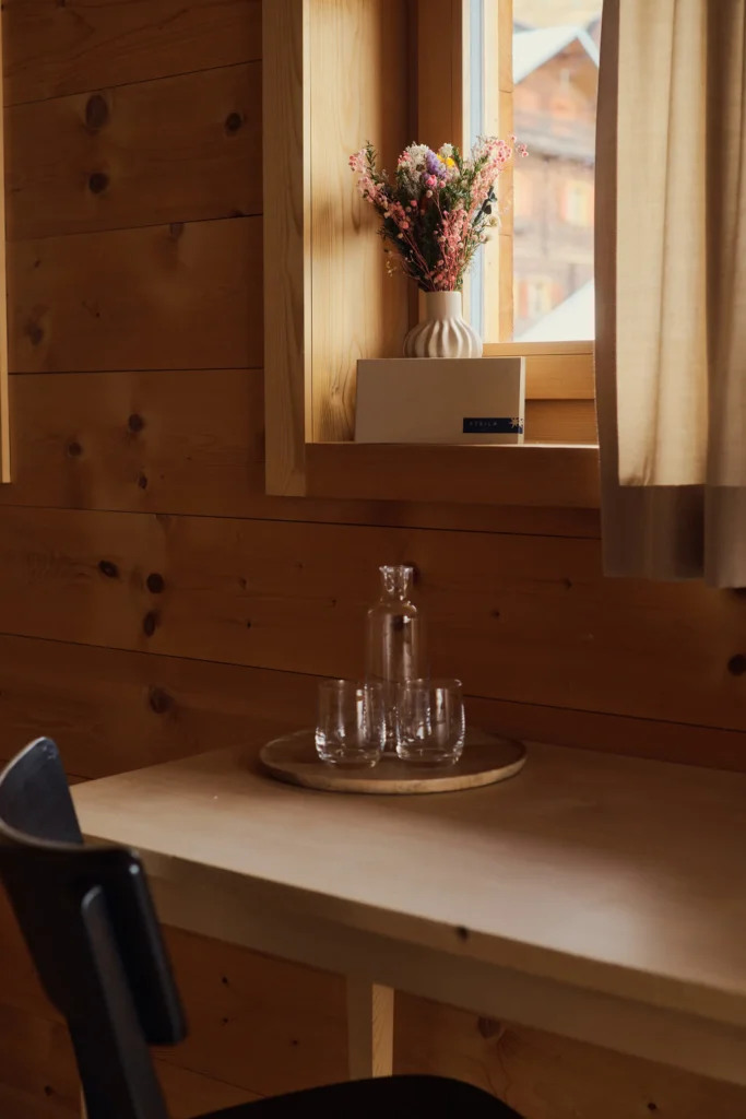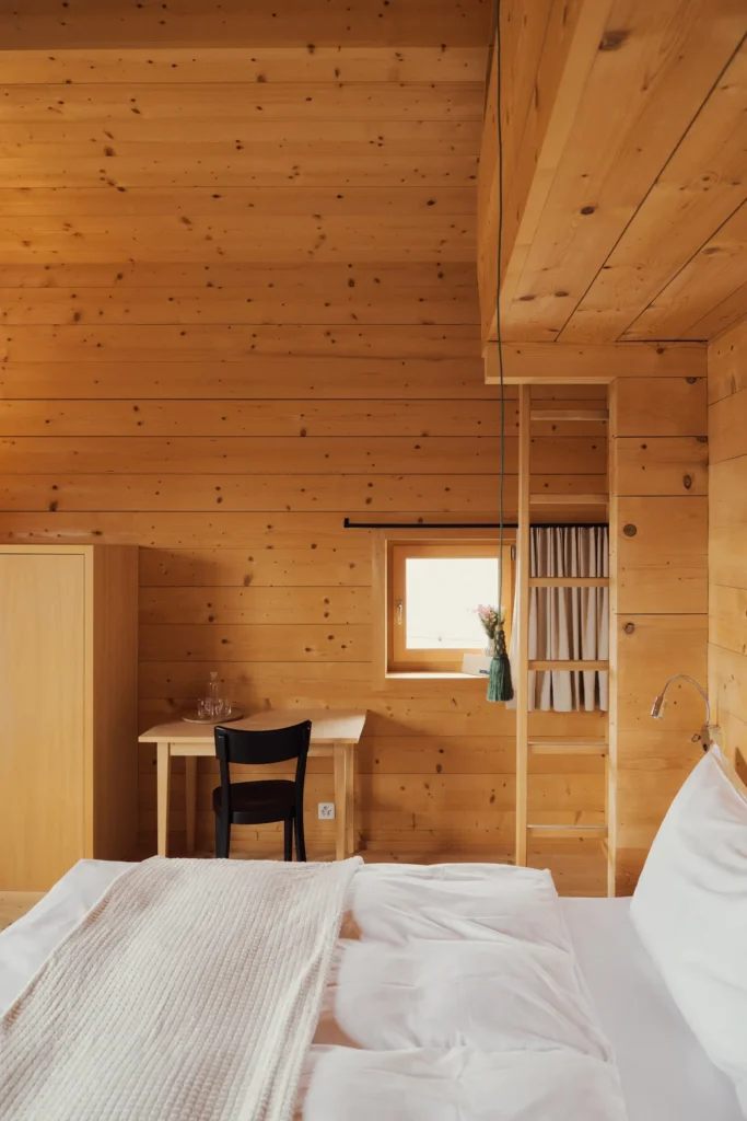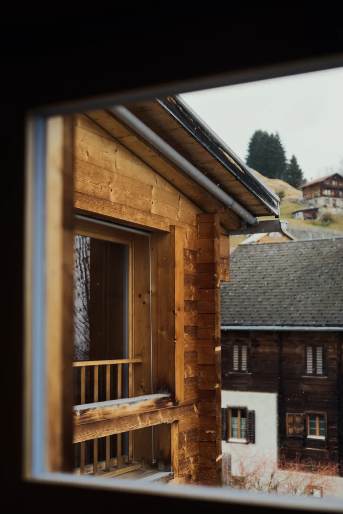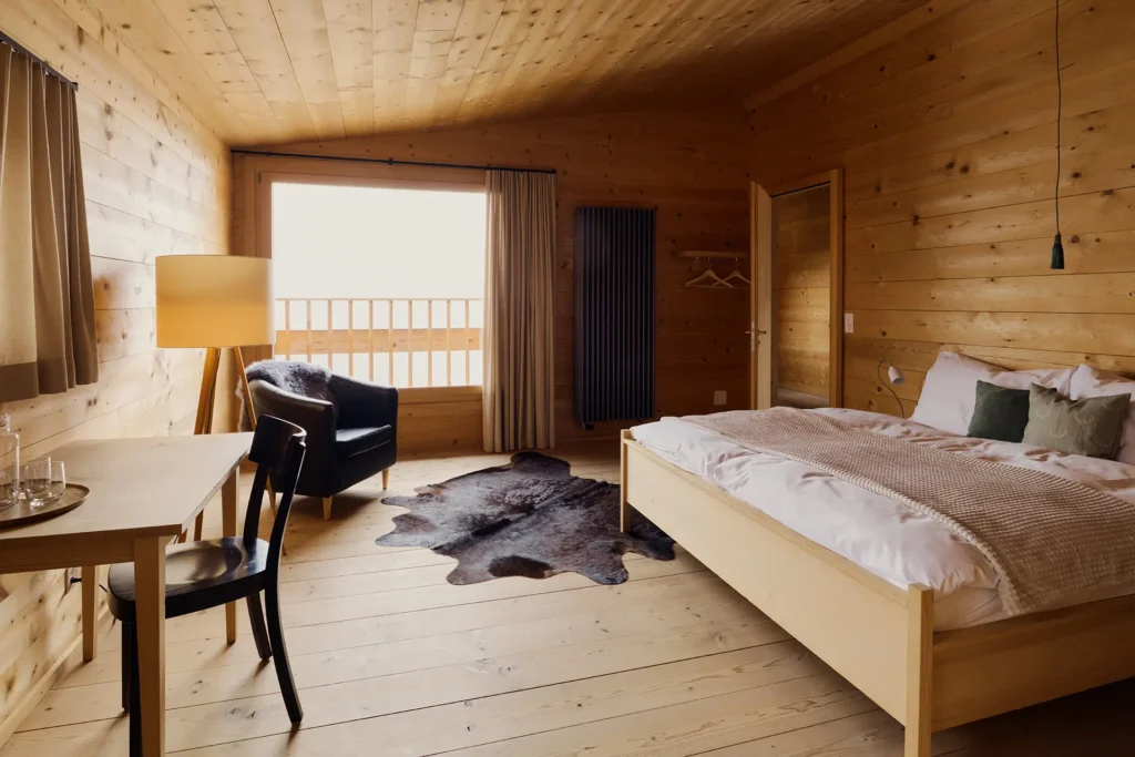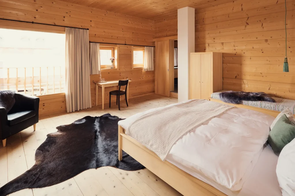 Alle Gäste mit einer Vorliebe für Morgensonne werden dieses Zimmer lieben. Einerseits eröffnet ein grosses Fenster den Blick auf das umliegende Bergpanorama, andererseits ist durch die seitlichen Fenster der Blick auf das intakte Bergdorf Siat möglich. Ein Zimmer voller Licht und Wärme.